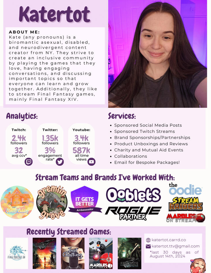 Kate (any pronouns) is a biromantic asexual, genderqueer, disabled, and neurodivergent content creator from NY. They strive to create an inclusive community by playing the games that they love, having engaging conversations, and discussing important topics so that everyone can learn and grow together. Additionally, they like to stream Final Fantasy games.They began streaming on Twitch because they started off streaming to their friends on discord and thought, "Why not try this on twitch?" and they have loved it ever since. Streaming has made them more into the games that they play, and they now have a new love for gaming! :)